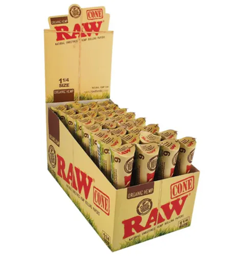 Raw Cones are made from Raw Natural paper and rolled expertly to a conical shape. Cones are as easy to fill as they are smooth to smoke. Feature a run preventing watermark and RAW Perfecto cone tip. The paper contains a blend of non-chlorinated fibers and are finished with a pure natural gumline to match the burn rate of the rolling paper. Display contains 32 packs with 6 cones in each. 192 cones per display.